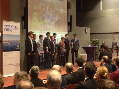 Tekst bij foto: De prijzen werden uitgereikt door wereldkampioen Magnus Carlsen, links op het podium. Daarna volgen de winnaars van VO 2, het Willem Lodewijk Gymnasum: Willem Mooibroek, Thijmen Bourgonjen, Eelke de Boer, Lodewijk van Vliet en Thijmen Nawijn.