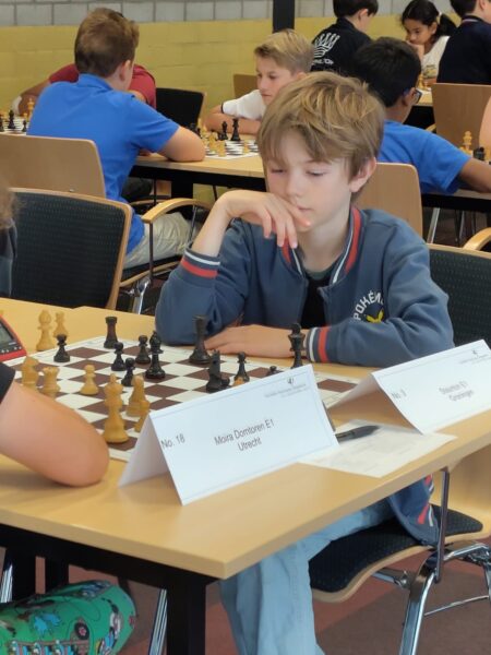 Olav, die ook nog bij de F mee mag spelen, verdedigde het eerste bord alsof hij dat al jaren doet! Tegen de landelijke toppers van de E-categorie pakte hij flink wat belangrijke punten voor het team.