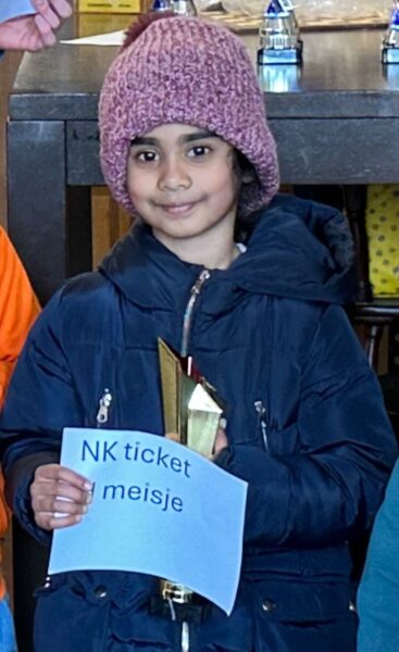Maar ze speelde remise tegen haar clubgenoot Nireina. Nireina scoorde 1,5 uit 6 en was daarmee het hoogst geëindigde meisje. En daarmee dus kampioen NOSBO H-Meisjes, waarmee ze ook een NK-ticket verdiende! Hartelijk gefeliciteerd!
