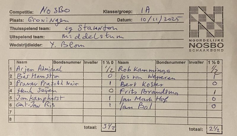Afgelopen maandag (10-11-2025) werd met 3,5 – 2,5 gewonnen, en dat mag een zeer goede prestatie genoemd worden. Middelstum, met een gemiddelde rating van 1883 en geen een speler onder de 1800, werd terecht als sterk beschouwd. Terwijl bij ons drie spelers zijn die een lagere rating hadden dan 1800.