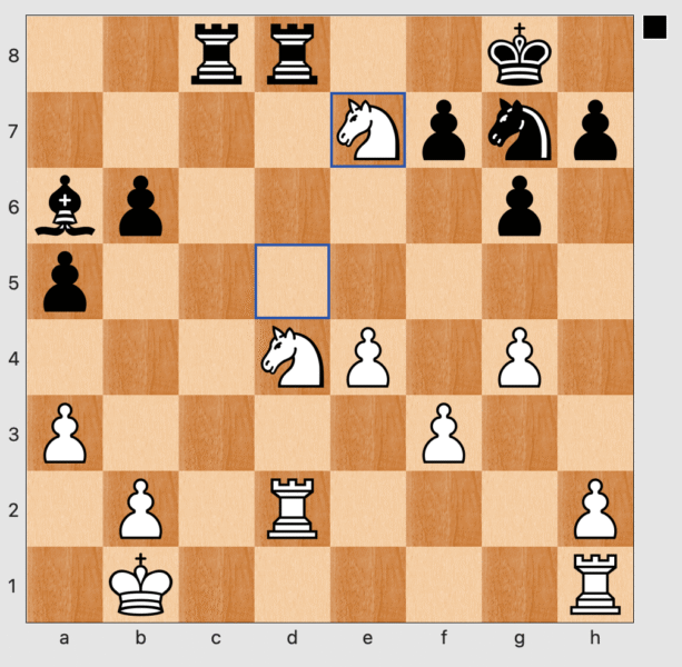 Toen ik alle openingsproblemen had weten te neutraliseren kwam ik steeds beter te staan. Mijn stukken gingen in het middenspel goed samenwerken en mijn tegenstander had het moeilijk. Hij had op een bepaald moment geen goede zetten meer en dat speelt lastig (weet ik uit ervaring). Mijn paarden deden hem uiteindelijk de das om. Met een vorkje gaf ik schaak en zou ik de kwaliteit winnen. Mijn tegenstander liet het zover niet komen en gaf op.