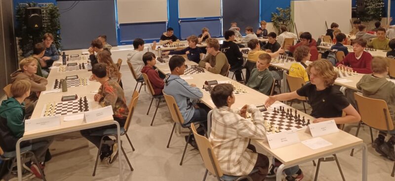 Daan (11 jaar) verdedigde het eerste bord met verve en scoorde 2,5 punt. Mrityunjay (Jay) is nog steeds pas 8 jaar oud en scoorde 3 uit 6 op bord 2! Alhassan (12) had het moeilijk op bord 3, maar won gelukkig wel een partij. En tot slot haalde Carolina, die nog steeds pas 10 jaar is, een knappe plusscore van 3,5 uit 6 op bord 4. Heel goed gedaan!