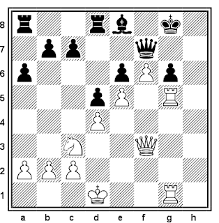 27. Lxc1? In aanmerking kwam Dxc1, Pxc1, Txc1 met materieel voordeel! 29. Lb2! Een elegante tegenzet. Na Dxb2 wint wit door Dxd3 gemakkelijk. 30. … Txf5? Hier was moeilijk te zien dat Dxf5 juist was, ofschoon de witspeler de laatste zet vreesde. Na 30. .. Dxf5 heeft zwart minstens remise (31. Te3 -wat anders? – Dg5+ met eeuwig schaak). Intussen moet wit ook na de tekstzet oppassen voor voetangels. Hij wint verder elegant. Na 31. Te8+ Kf7 dreigt De7+ en minstens dameruil.