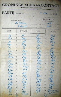 Er zijn vervolgens geen partijen meer genoteerd. Eind 1952 is Henk Bunt dus opgehouden zijn partijen over te nemen in aparte schriften. Wat rest is een los notatieformulier, met zijn partij in de volgende ronde tegen Orbaan. Ik geef daarvan hier een kopie.