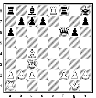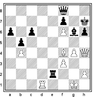 27. Lxc1? In aanmerking kwam Dxc1, Pxc1, Txc1 met materieel voordeel! 29. Lb2! Een elegante tegenzet. Na Dxb2 wint wit door Dxd3 gemakkelijk. 30. … Txf5? Hier was moeilijk te zien dat Dxf5 juist was, ofschoon de witspeler de laatste zet vreesde. Na 30. .. Dxf5 heeft zwart minstens remise (31. Te3 -wat anders? – Dg5+ met eeuwig schaak). Intussen moet wit ook na de tekstzet oppassen voor voetangels. Hij wint verder elegant. Na 31. Te8+ Kf7 dreigt De7+ en minstens dameruil.