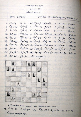 1. d2-d4 Pg8-f6 2. c2-c4 e7-e6 3. Pg1-f3 b7-b6 4. Pb1-c3 Lc8-b7 5. e2-e3 Lf8-b4 6. Lc1-d2 Lb4xc3 7. Ld2xc3 Pf6-e4 8. Lc3-b4 c7-c5 9. Lb4-a3 d7-d6 10. Lf1-e2 0-0 11. 0-0 Pb8-d7 12. Pf3-d2 Pe4xd2 13. Dd1xd2 Pd7-f6 14. f2-f3 Dd8-c7 15. b2-b3 e6-e5 16. La3-b2 Tf8-e8 17. Ta1-d1 Ta8-d8 18. Dd2-c2 Dc7-e7 19. d4-d5 Lb7-c8 20. Td1-e1 Te8-f8 21. Le2-d3 Td8-e8 22. Ld3-f5! (Deze zet had zwart kunen verhinderen) … Lc8xf5 23. Dc2xf5 De7-d7 24. Df5-g5 h7-h6 25. Dg5-h4 Dd7-f5 26. e3-e4 Df5-g5 27. Dh4xg5 h6xg5 28. Lb2-c1 Pf6-h7 29. g2-g3 f7-f6 30. Kg1-g2 Tf8-f7 31. Tf1-f2 Ph7-f8 32. f3-f4 g5xf4 33. g3xf4 g7-g6? (Waarom niet Pg6?) 34. f4xe5 f6xe5 35. Tf2xf7 Kg8xf7 36. Lc1-h6 Pf8-d7 37. Te1-f1+ Kf7-g8 38. Kg2-g3 Pd7-f8? 39. Tf1-f6 Te8-d8 40. Lh6xf8 Td8xf8 41. Tf6xd6 Opgegeven. Wederom zeer zwak en zonder zelfvertrouwen gespeeld, zodat het eindresultaat wel juist kan worden genoemd.