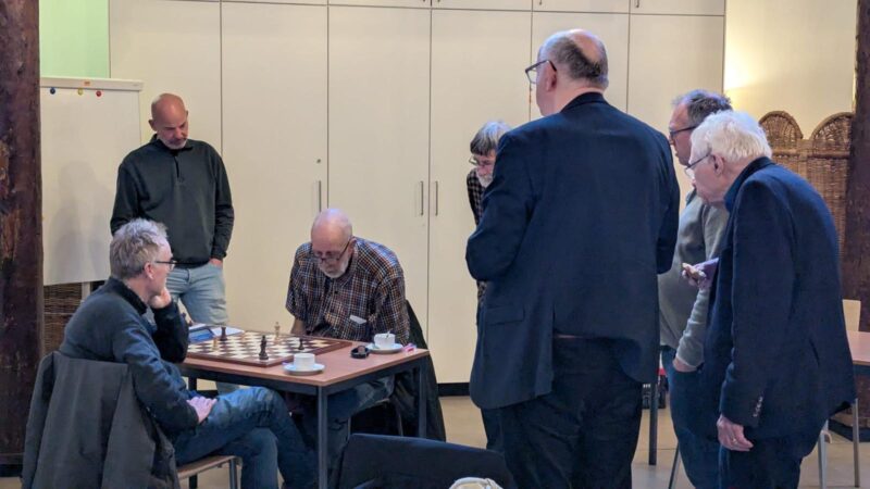 Ook Christine en Wiert hadden mooie stellingen op het bord weten te krijgen. Beide wonnen hun partijen en dat zag er dus voor ons goed uit. Henk en Hans speelden remise. Henk had nog een spannend eindspel, maar handelde dat vakkundig af. Hans, leuk dat je kon invallen en met ons mee kon spelen, en had, om in zijn eigen woorden te spreken, zijn best gedaan. Meer zat er volgens hem ook niet in en werd het dus remise.